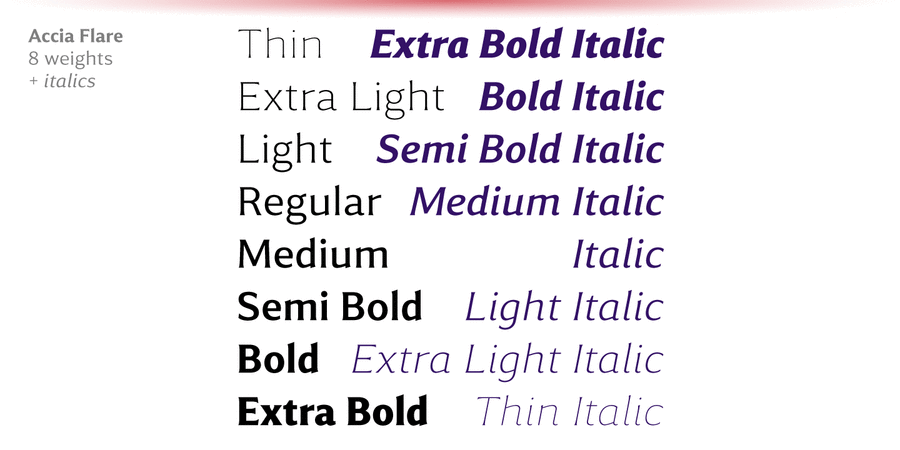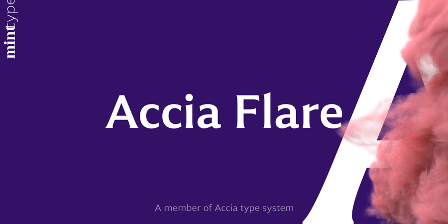 Accia Flare is an elegant glyphic typeface with large x-height and low contrast. Its subtle curviness will create a tender but notable image in packaging applications. The font family contains 8 weights from Thin to Extra Bold, with matching true italics. It supports extensive language support including Cyrillic, as well as numerous OpenType features such as small caps, ligatures, several sets of figures, case-sensitive punctuation, ordinals. Accia Flare is a member of Accia Type System. It encompasses five typefaces ranging from sans-serif to expressive serif, giving you the possibility to create sophisticated cohesive designs. Accia Type system consists of Accia Sans, Accia Flare, Accia Piano, Accia Moderato, and Accia Forte. The typeface was designed by Andriy Konstantynov and released in Mint Type foundry in 2021.