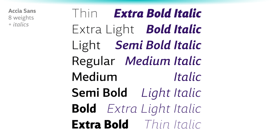 Accia Sans is a humanist sans-serif typeface with character. Its strong features make an outstanding performance in branding applications, as well as in editorial designs. The font family contains 8 weights from Thin to Extra Bold, with matching true italics. It supports extensive language support including Cyrillic, as well as numerous OpenType features such as small caps, ligatures, several sets of figures, case-sensitive punctuation, ordinals. Accia Sans is a member of Accia Type System. It encompasses five typefaces ranging from sans-serif to expressive serif, giving you the possibility to create sophisticated cohesive designs. Accia Type system consists of Accia Sans, Accia Flare, Accia Piano, Accia Moderato, and Accia Forte. The typeface was designed by Andriy Konstantynov and released in Mint Type foundry in 2021.