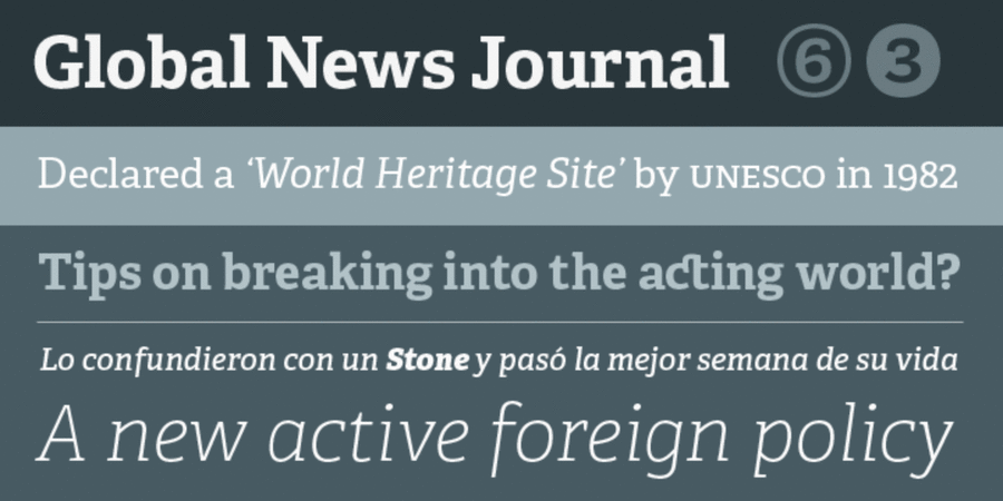 The intermediate weights deliver a very legible and neutral look when used in text sizes, providing the usual robustness expected in a newspaper font. The unobstrusive appearance, excellent texture and slightly dark color allow it to behave flawlessly in continuous text setting, even in the most demanding editorial applications.