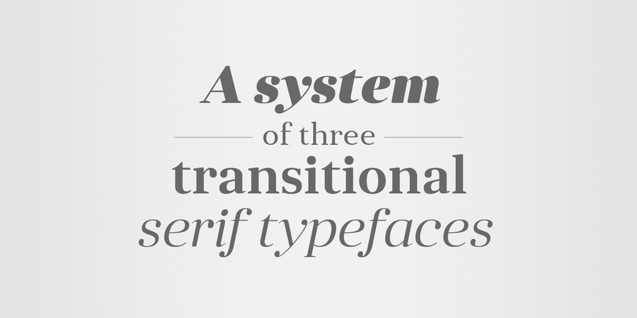 Anglecia Pro is an exquisite and versatile system of three transitional serif typefaces designed to work together in editorial design. Sharing the same skeleton, vertical axis, and trapezoidal uncurved serifs, each of these faces bears different key dimensions and different contrast typical for three different type epochs.