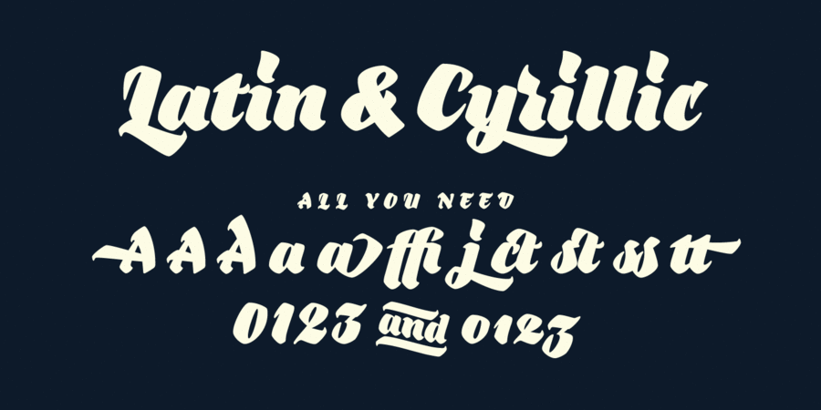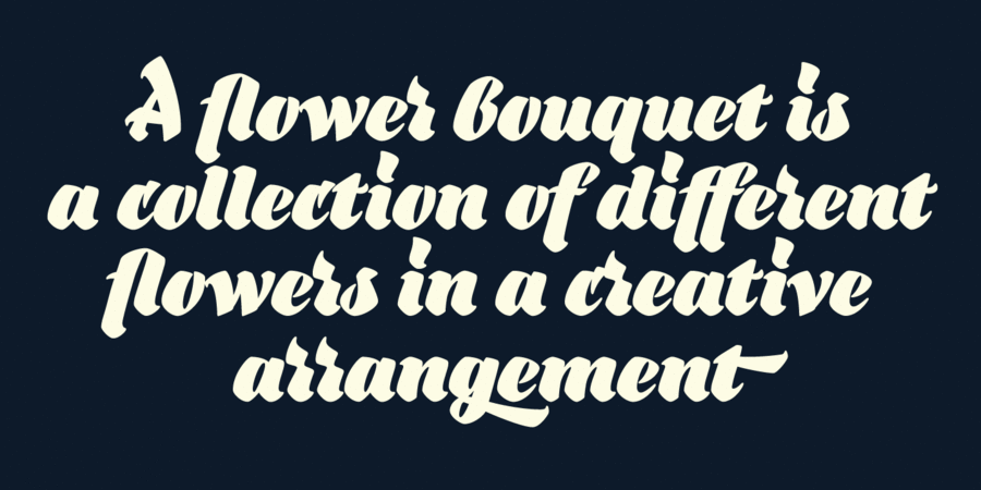 Bouquet font is a cursive fat typeface influenced by brush writing and skilfully flavored with elements of fractura. The result is really amazing – a font with bespoke personality, strong unique presence and classy standing out amongst the other look. Type designer Dzianis Serabrakou really did well in every single letterform, aperture, curve and line, but this was probably below satisfactory and he didn’t stop here – Denis developed the font to a higher level by making it fully open-type compatible. Bouquet supports large set of multilingual diacritics plus a beautifully designed set of Cyrillic characters. Additionally you will be able to use also ligatures and really lots of alternative symbols to bring more life, versatility and personalization in your work. Initially Bouquet has been designed as a logo font – it is so identical that could easily turn every brand name into logo icon. Furthermore this font is perfect for designing t-shirts, typographic posters, packaging etc and it is highly recommended for letterpress as well as for normal offset and screen printing. The typeface was designed by Denis Serebryakov in 2014.