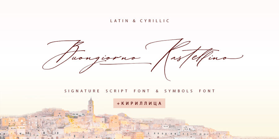 The enchanting sweepy of fast handwriting of script font Buongiorno Rastellino will be the perfect complement for all your projects. The font pair Buongiorno Rastellino Cyrillic + Buongiorno Rastellino Symbols is the best option for branding, logos, social media pictures, packaging, business cards, DIY projects, social media,and many others.and other projects. Buongiorno Rastellino script Latin part contains a full set of uppercase letters and 3 full sets of lowercase letters, (standard, initial and final forms with flourishes or teils. To make a needed form just type a letter with a number such as a1, b1, c1...after that selecting the word and apply the Open Type Features in programs such as Adobe Illustrator, Photoshop, and others) And 43 ligatures - which can be used to create a handwritten calligraphy look. The Cyrillic part of the font contains the uppercase letters and 3 full sets of lowercase letters, (standard, initial and final form. To make a needed form just type a letter with a number such as a1, б1 в1... After that select the word and apply the Open Type Features in programmes such as Adobe Illustrator, Photoshop, and others) Buongiorno Rastellino Symbols is a font with over 36 hand-drawn elements, floral illustrations, and swashes and can help to make your design unique and matchless. Combine and merge swashes and illustrations to create your own designs and make borders, frames, dividers, logos, and more (just use A-Z or a-z and 0-9 keys in the included Buongiorno Rastellino Symbols font). Multilingual Support for 31 languages, including Cyrillic support for Russian, Belorussian, Bulgarian, and Ukrainian languages. The typeface was designed by Iryna Dvilyuk in 2020.