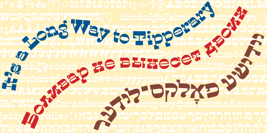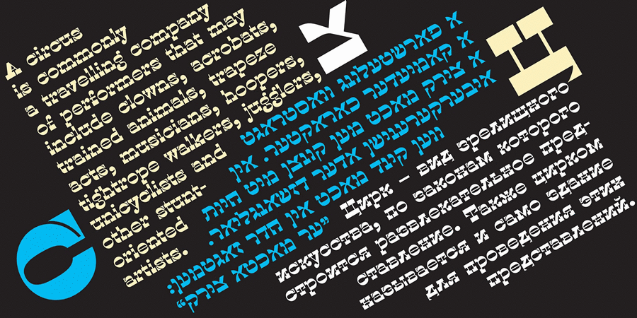 Caslon1821 is a revived "Italian" typeface of foundry Caslon & Livermore, 1821. The typeface quickly extended across Europe and America. It came to Russia from France and became very popular in the 30s of the XIX century. It's Cyrillic versions were offered by type foundries of Revillion and Co., Pluchard, Semen, etc. In our version we also added support for Hebrew (with vowels). Designed by Viktor Kharyk, Konstantin Golovchenko in 2014.
