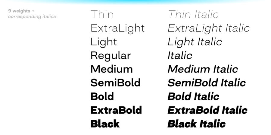 Closer comes in 9 weights (18 styles altogether), features extensive language support including Cyrillic and is highly customizable with 7 stylistic sets to mix and match.