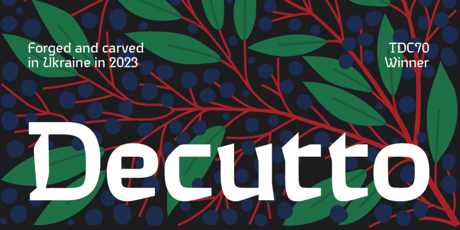 Decutto is a neo-grotesque that packs the Marionette formula and some blackletter ideas into a low-contrast sans serif design. The typeface has TDC Certificate of Typographic Excellence. Its name plays on the phrases “off cut” and “cut to,” which express its key feature – the contemporary legible letter shape is decorated with straight carved edges and counters, giving the typeface a crisp and simplistic look, like that of an old minted coin.