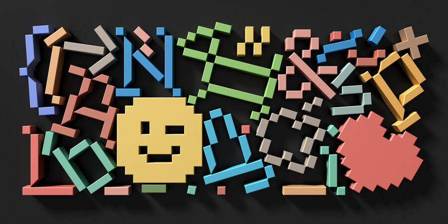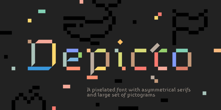 Depicto is a pixelated typeface with asymmetrical serifs intended to depict emojis in coarse mosaic shapes and represented in two styles that perfectly complement each other – Mono (casual font) and Mosaic (color font). The main font feature is a large set of pictograms, which are activated using the Stylistic Set 1 and typed directly in text with keywords like :smile: :happy: :sad: :pear: :rose: :horse: :bike: :house: and so on. See the complete list of 600+ pictograms in the Specimen PDF.