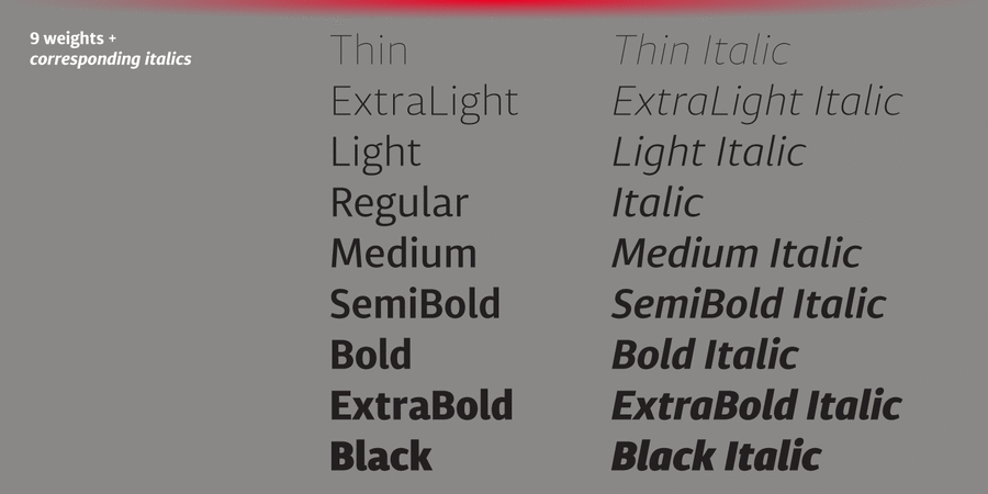 This modern sans-serif typeface designed as a universally legible medium for both titles and paragraph text. Its large x-height and static exteriors allow comfortable reading in printed narrow columns as well as in screen graphics.