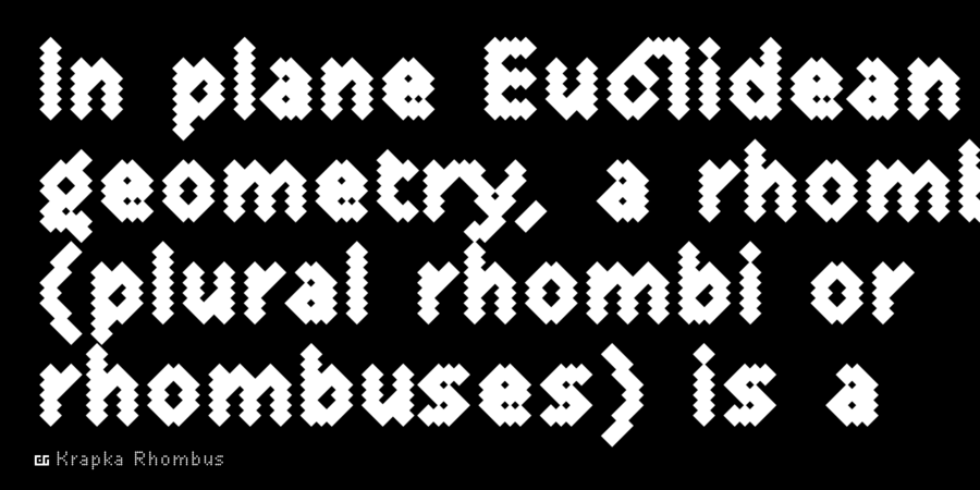 In this font family, the pixel has a diamond shape. The font supports OpenType features and contains small capitals, ligatures, oldstyle figures, terminal forms, historical forms, stylistic sets. The dingbats, arrows, emoji are also present. For small texts, it is recommended to use DR Krapka Rhombus FontSize10px in the font size 10 px. DR Krapka Rhombus typefamily supports European languages based on Latin, Cyrillic and Greek scripts. If you want to use fonts with a different shape of pixels, there are also typefaces from DR Krapka family: DR Krapka Square, DR Krapka Round. The typeface was designed by Dmytro Rastvortsev in 2020.