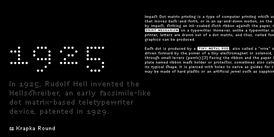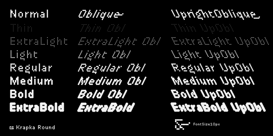 In this font family, the pixel has a round shape. The font supports OpenType features and contains small capitals, ligatures, oldstyle figures, terminal forms, historical forms, stylistic sets. The dingbats, arrows, emoji are also present. For small texts, it is recommended to use DR Krapka Round FontSize10px in the font size 10 px. DR Krapka Round typefamily supported European languages based on Latin, Cyrillic and Greek scripts. If you want to use fonts with a different shape of pixels, there are also typefaces from DR Krapka family: DR Krapka Square, DR Krapka Rhombus. The typeface was designed by Dmytro Rastvortsev in 2020.
