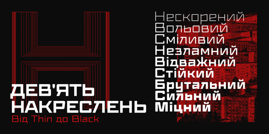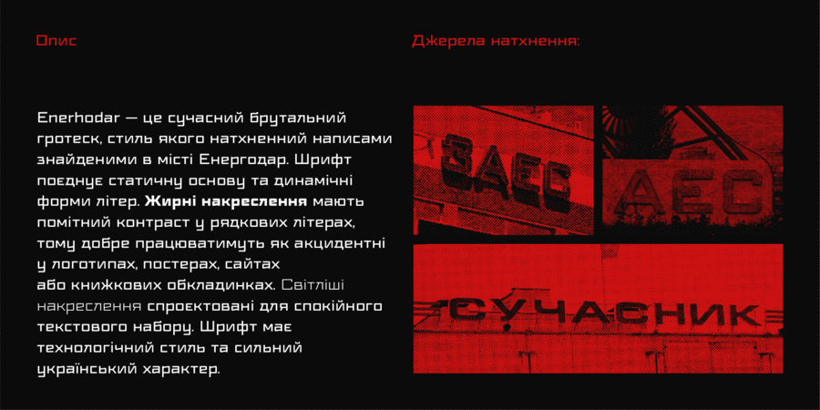 Enerhodar is a modern brutalist sans serif typeface, the style of which is inspired by signboards found in the Ukrainian city of Enerhodar. The font combines a static base and dynamic letterforms. Bold styles have a noticeable contrast in lowercase letters so they will work well as a display typeface in logos, posters, websites, or book covers. Light styles are designed for calm typesetting. The font has a technological style and a strong Ukrainian character. Designed by Maksym Burov and Serhii Makarenko in 2024.