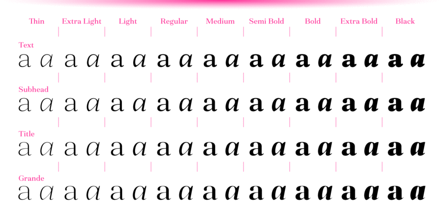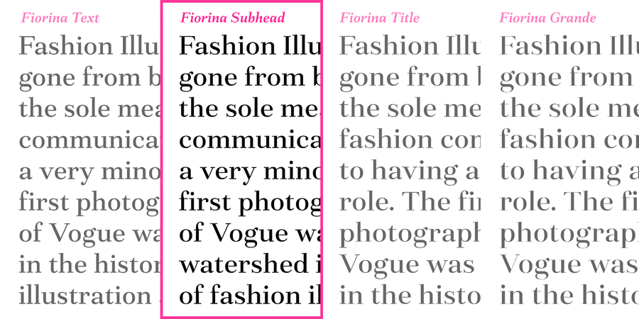 A subfamily for subheadings. Fiorina is a modern Didone-style serif typeface of 72 fonts. It comes in 4 optical sizes, ranging from Text with moderate contrast to super-contrasted Grande. Each of the 4 sets comes in 9 weights with corresponding sophisticated italics. The overall variety of styles makes Fiorina the ultimate magazine typeface. The glyph set supports all European Latin-based languages, as well as all major languages that use Cyrillic script. The type family also suppors numerous OpenType features, including 6 sets of digits, small caps, fractions, superscript and subscripts, ordinals, and more. The typeface was designed by Andriy Konstantynov and released in Mint Type foundry in 2020.
