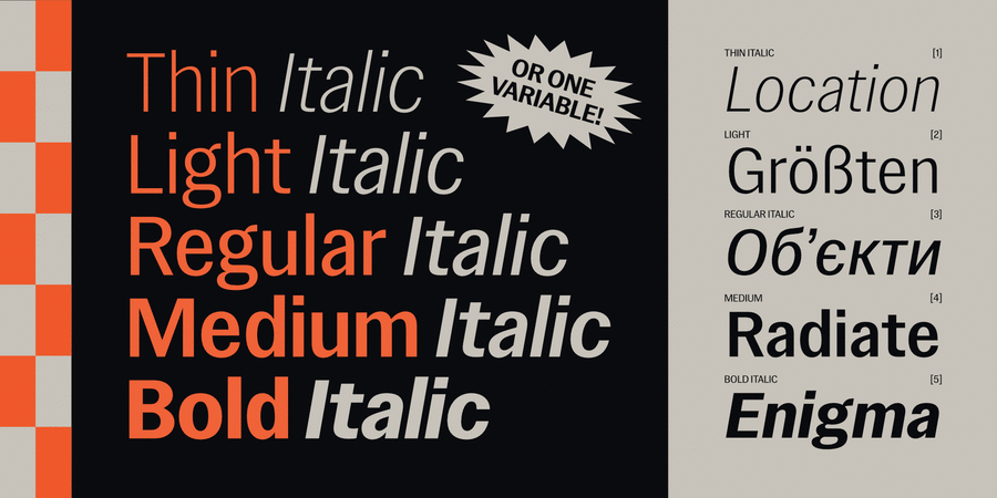 Compared to geometric or neo-grotesques, Gart Sans stands out with its unique details. Its narrow proportions offer flexibility across different contexts, while its subtle contrast adds expressiveness to the text, becoming more pronounced with increasing weight. This font is ideal for both headlines and setting large amounts of text. In addition to static styles, Gart Sans also includes a variable font, expanding its usage possibilities. Gart Sans consists of 10 styles, 630 glyphs, an italic of 10°, and includes an extended set of Latin, basic Cyrillic, ligatures, numeral sets, and much more. The update includes a 10° italic for each style, making the typeface more dynamic; general contours and kerning have also been improved. This typeface was designed by Vitalii Hotsaniuk in 2023 and updated in 2024. The quick brown fox jumps over the lazy dog