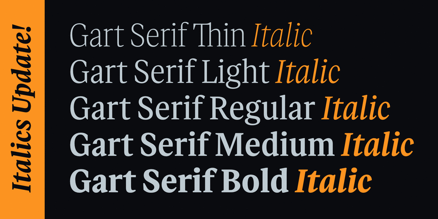 Gart Serif is a serif typeface rooted in the traditions of transitional serifs from the 18th century, combined with modern design solutions. Compared to other transitional serifs, Gart Serif stands out with its narrow proportions, distinct contrast, and subtle slant of the curves, which enhance its character while maintaining readability. Gart Serif is an ideal font pair for Gart Sans.