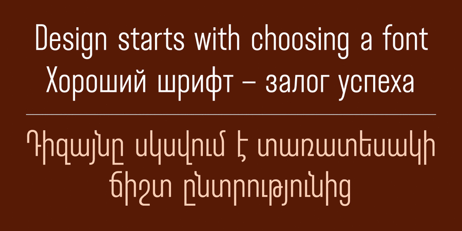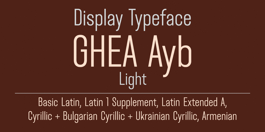 This compact display font can be used in titles, posters, labels and small texts. Ayb includes Basic Latin, Latin 1 Supplement, Latin extended A, Cyrillic + Bulgarian Cyrillic + Ukrainian Cyrillic, Armenian. The typeface was designed by Edik Ghabuzyan in 2020.