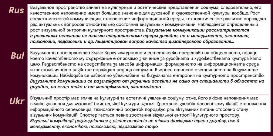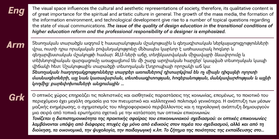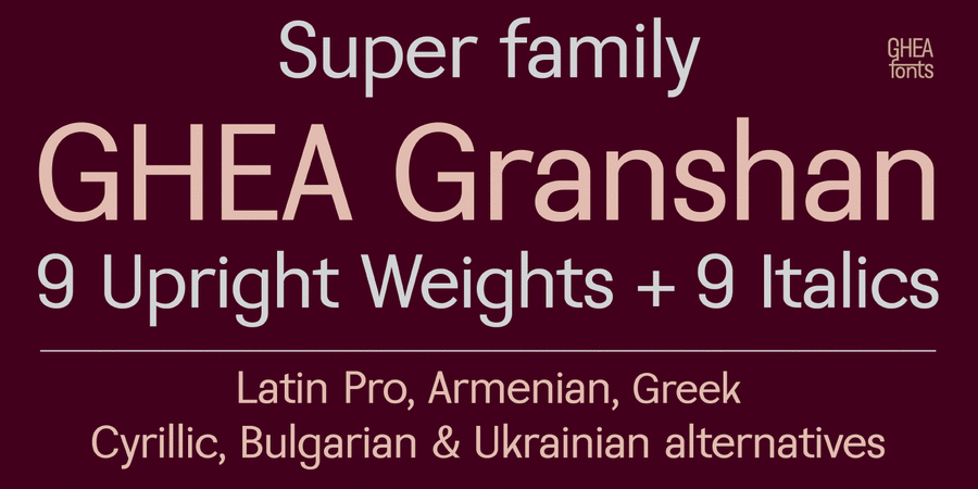 This super font family has 9 upright weights and their Italics. It supports Latin Pro, Armenian, Greek, Cyrillic, Bulgarian & Ukrainian alternatives alphabet systems. The weights from Regular to Bold and their Italics can be used as text fonts. The weights thinner than Regular and thicker than Bold can be used as Display fonts. It is an easily readable font and the eyes don't get tired while reading. GHEA Granshan has a slight contrast style and at the same time is quite bright and clear. The typeface was designed by Edik Ghabuzyan in 2021.