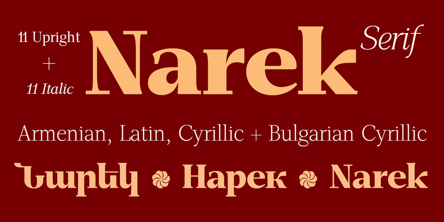 GHEA Narek Serif is multifunctional high contrast modern typeface. It can be used as Display as well as Text font. The family includes Armenian, Cyrillic and Latin alphabets. The typeface was designed by Edik Ghabuzyan in 2014.