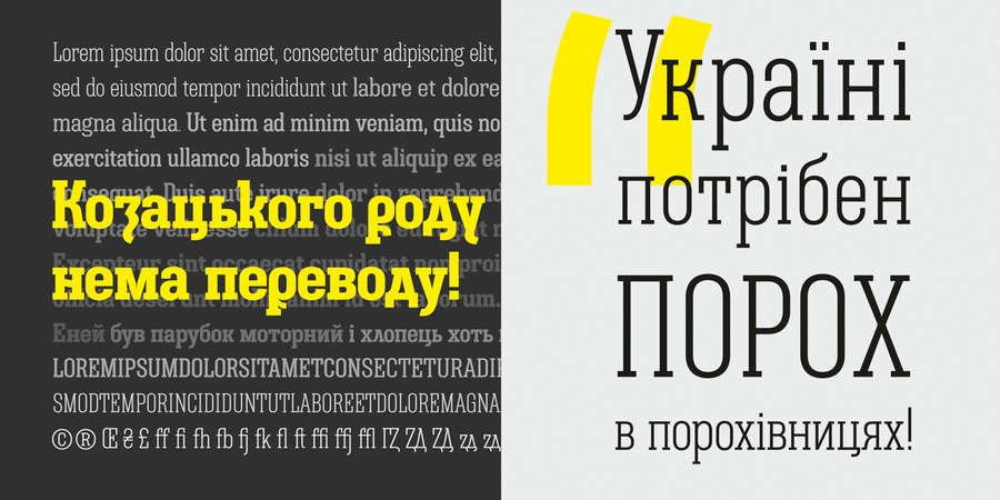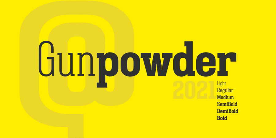 This is a narrow geometric Slab Serif typeface with a calm personality in 6 styles. The scope of use is display. Gunpowder supports Latin, Cyrillic, Ukrainian Cyrillic as an alternative stylistic set. It also has many ligatures. The typeface was designed by Tetiana Ivanenko in 2021.
