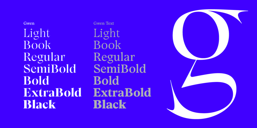 Gwen is a variable type system in 7 weights. The complete font family consists of two subfamilies: the highly characteristic Display Serif family which shows its full potential and beauty in big sizes and simpler Text variation appropriate for smaller sizes. The variable font combines the best of both worlds and provides unique flexibility to switch between all of the font weights and the text and display style at the same time. The font supports Extended Latin and Cyrillic scripts and its main purpose is to be used in editorials, although it may find good implications in headlines, impactful landing pages, posters, and packaging. OpenType Features: Common Ligatures, Discretionary Ligatures, Contextual alternates, Localised Forms, Diagonal Fractions, Denominator, Numerator, Case Sensitive Forms Ordinals. The typeface was designed by Pavel Pavlov and Plamen Motev in 2022.