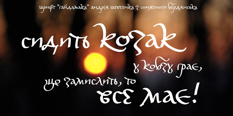 Hajdamaka is an uncompromising typeface without kerning, without uppercase letters, without historical prototypes, but certainly with notable personality! Created back in 2007, this script, named after the haidamaks, Ukrainian guerrilla fighters of past centuries, lines lively and brazenly in the text. The typeface was exhibited at the legendary festival "Свято Кирилиці" in Kharkiv, and used to be a part of the tourist logo of Ukraine. Hajdamaka contains European Cyrillic and unaccented Latin characters, numbers and some additional characters. The money from the sale of this font goes to charity, read the details here: https://www.facebook.com/groups/151717195372009/posts/1008076373069416/ The typeface was designed by Andrij Shevchenko. Promo pictures by Bohdan Hdal.