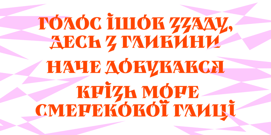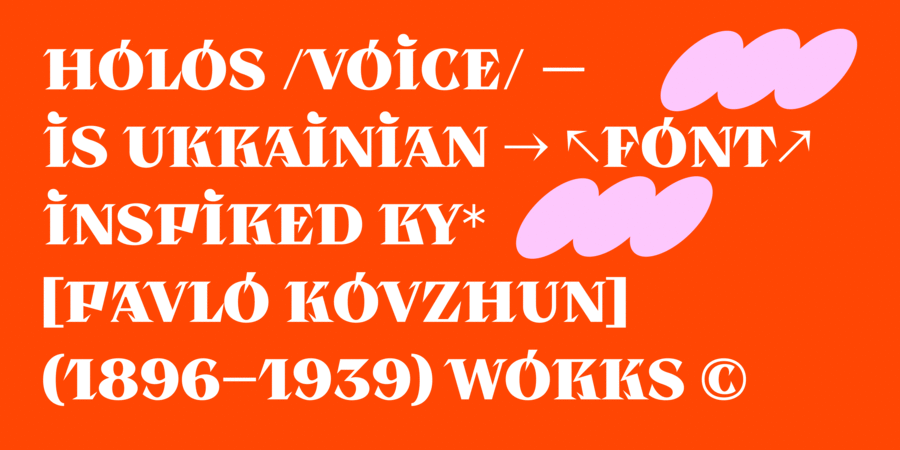 Holos (Voice) is a modern Ukrainian font, inspired by the lettering of the Ukrainian graphic artist of the 20s and 30s of the 20th century, Pavlo Kovzhun. Ukrainians have a very rich cultural heritage, which was suppressed and hidden for years. Our task as designers is to find and revive it. The font has sharp shapes and an authentic Ukrainian character. Holos does not support the russian language, and if you try, it will show a trident. Be heard with Holos! The typeface was designed by Alyona Korysta in 2023.