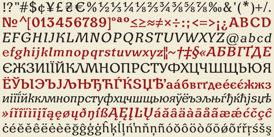 The font perfectly suits typesetting texts, is well-read in small sizes, and due to a distinct character can be successfully applied in printing.