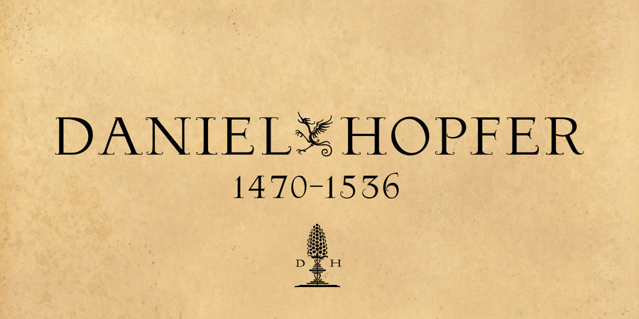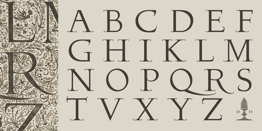 This font has been developed based on the engraving by the German artist Daniel Hopfer (1470-1536) listing the Latin ABC. While creating the font I tried to preserve the archaism and certain imperfection characteristic for the prototype to accentuate its charm. Fanciful convolution on the serif make it a bit fairy-tale like and cheerful. The font is also available with decorated dots as in the original version. All the letters in the font are capital. The digital version of the typeface was designed by Lukyan Turetskiy and Maria Sokil in 2013.