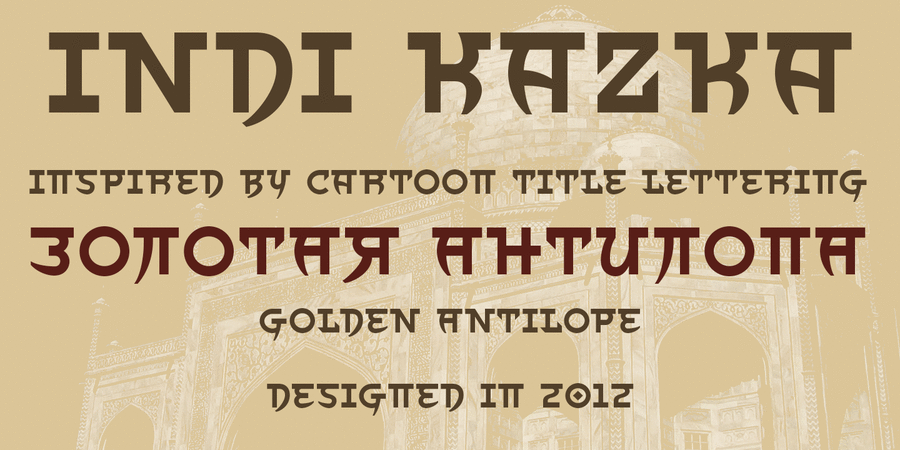Indi Kazka 4F is a display geometric sans serif stylized to Devanagari. The font was inspired by lettering from the cartoon "Golden Antelope"(1954) based on Indian tales.