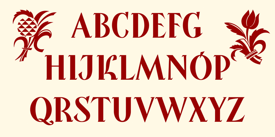 The Kalyna font is interesting with its stylistic implementation through asymmetrical serif. Such design is characteristic for the Ukrainian style. The drawing of the font is based on the sketches of a famous Ukrainian graphic artist of early 20th century Heorhiy Narbut. His work set the whole school in the Ukrainian graphic art and is still very influential nowadays. The font is capital and also includes a set of ornaments in addition the standard set of symbols. The typeface was designed by Alexandra Alexandrova and Lukyan Turetskiy in 2014.