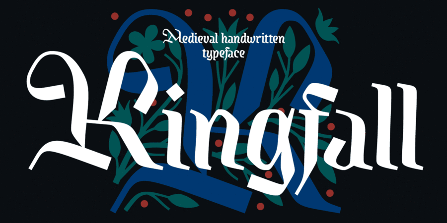 Kingfall is a handwritten medieval typeface sketched with a flat calligraphic nib. Its design is built on the contrast between small condensed lowercase letters and large decorative uppercase letters that can also function as initials. The shape of the letters has numerous rough bends and hard edges, as if the royal blacksmith took a strip of iron and shaped it with a hammer. At the same time, the direction of strokes avoids geometric rectilinearity, thereby adding a human touch to the letterforms. The font family is represented by optical sizes: the high-contrast “Blessed” for headlines and the medium-contrast “Dark” for small text sizes. The typeface was designed by Michael Rafailyk in 2024.