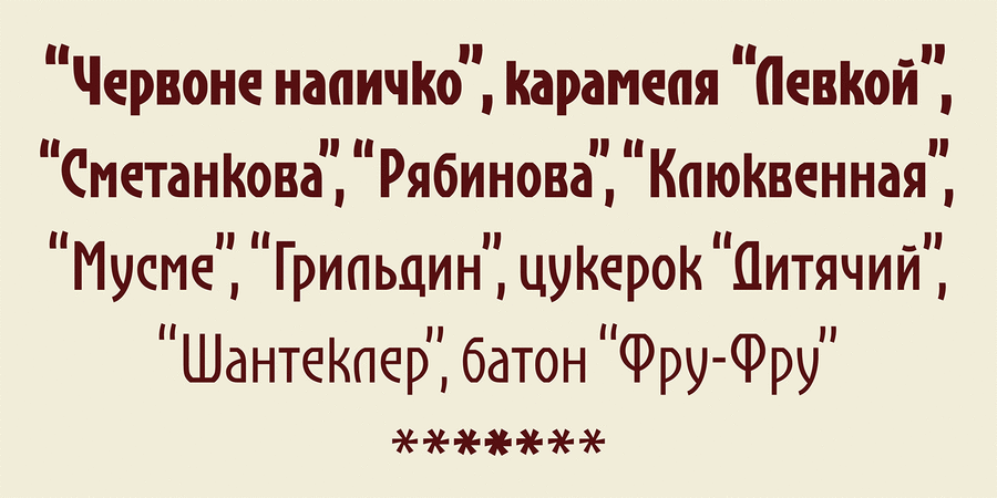 The basis of this font was the advertisement of the Kyiv confectionery factory. Then the font was expanded to a family, which greatly increased its usability. Stylistically, the font bears all the signs of Art Nouveau sans serif – optical axes shifted up and down, curved arcs and straight strokes, capricious and unexpected solutions of individual letters. At the same time, some geometrization allows it to confidently keep the line, and the narrowed proportions and light styles are great for composing small inscriptions in advertisements, signboards, magazines, menus, packaging, etc. The typeface was designed by Viktor Kharyk and Gennady Zarechnyuk in 2019–2020.