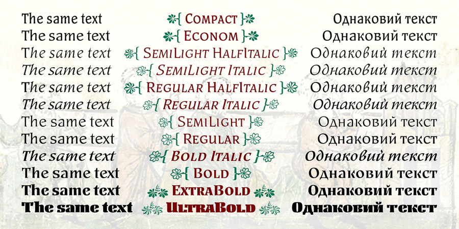 Kyiv is an attempt to unite old-style antiqua with the Ukrainian tradition and modern requirements. Besides having usual italics the Renaissance tradition of "semi-italics" renewed, compact weights are also provided. Special charm is added by decorative motives of chestnut leaves and flowers. The weights are included to promote the solution of various tasks both text, and a display set in various combinations. Kyiv was awarded in category of text fonts in the first Ukrainian typeface competition Ruthenia in 2010. The typeface was designed by Viktor Kharyk in 2010-2016.