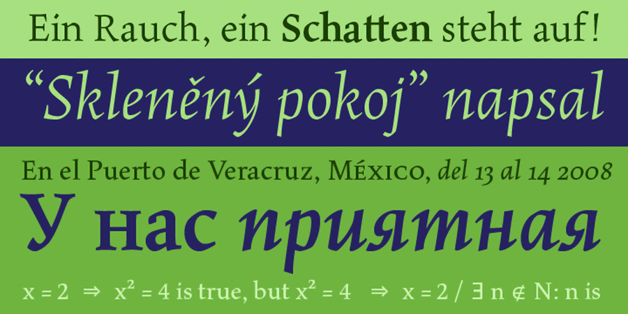 With the advent of Opentype, allowing for bigger character-sets and better language support, as a natural consequence, Maiola Multiscript covers Latin A, Cyrillic and Greek. Although basically independent from each other, they are, however, designed in the same spirit as the Latin, and harmonize well in multilingual text settings.