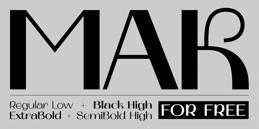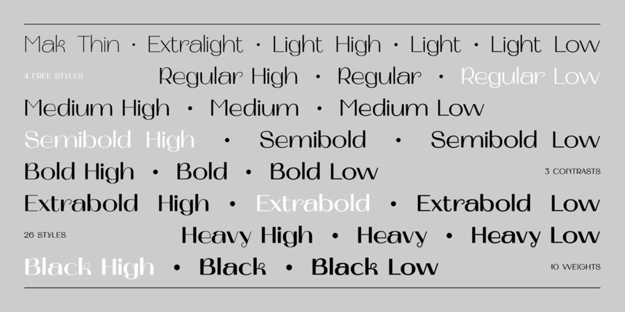 The typeface includes 4 free font styles: Mak Regular Low, Mak Semibold High, Mak Extrabold, Mak Black High. They are available under the Open Font License (OFL).
