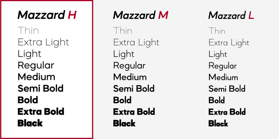 Mazzard H is a part of a font superfamily Mazzard. This family has high lowercase characters. The superfamily contains of three geometric grotesques with three different x-heights. It features rich language support and offers a wide variety of alternate forms to choose from. The typeface was designed by Oleh Lishchuk in 2019.