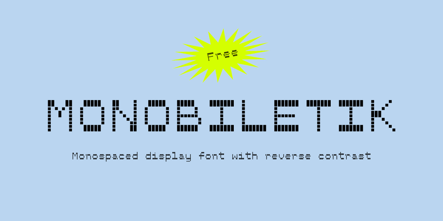 Font Family Monobiletik has a free license. The terms of this license are specified in the text description of the font family and/or in the archive with the free font. Any questions? Write a message