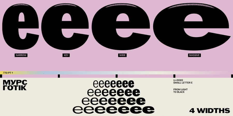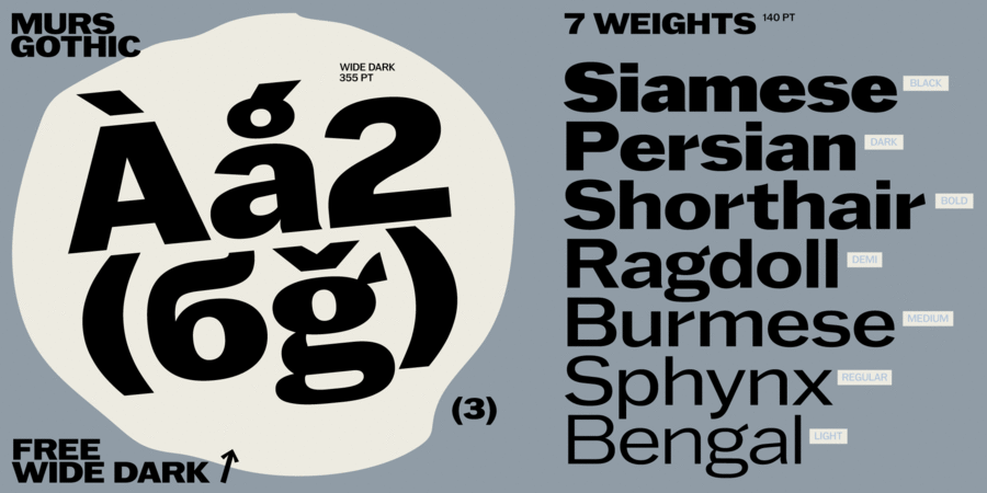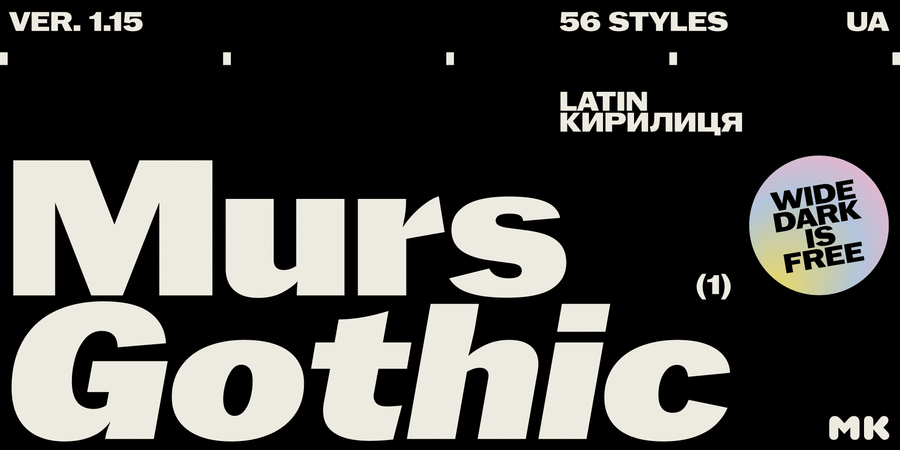 All styles include an extended set of Latin characters and a basic Cyrillic. A font style Murs Gothic Wide Dark is free for unlimited use under the “Desktop” and “Web” licenses. Murs Gothic was designed by Maksym Kobuzan in 2023.