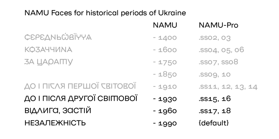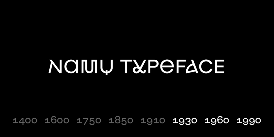 NAMU Modernism – fonts 1930, 1960, 1990 from free typeface for the National Art Museum of Ukraine. NAMU is a geometric sans serif with a deep history and daring experiments. Red Dot winner 2019 at Corporate Design and Identity category. At the end of 2018, the National Art Museum of Ukraine and Banda agency presented a new identity. The NAMU typeface became the basis of the visual style. To create this basis, designer Dmytro Rastvortsev immersed himself in the research of the museum fund, archival documents and outlines of ancient letters. As a result, the final NAMU typeface has 20 stylistic sets in the NAMU Pro version and 9 separate font styles for each historical period. NAMU typeface is free for commercial and non-commercial use. But the font files must not be decompiled. License Creative Commons CC BY-ND 4.0. Created by Dmytro Rastvortsev in 2018-2022.