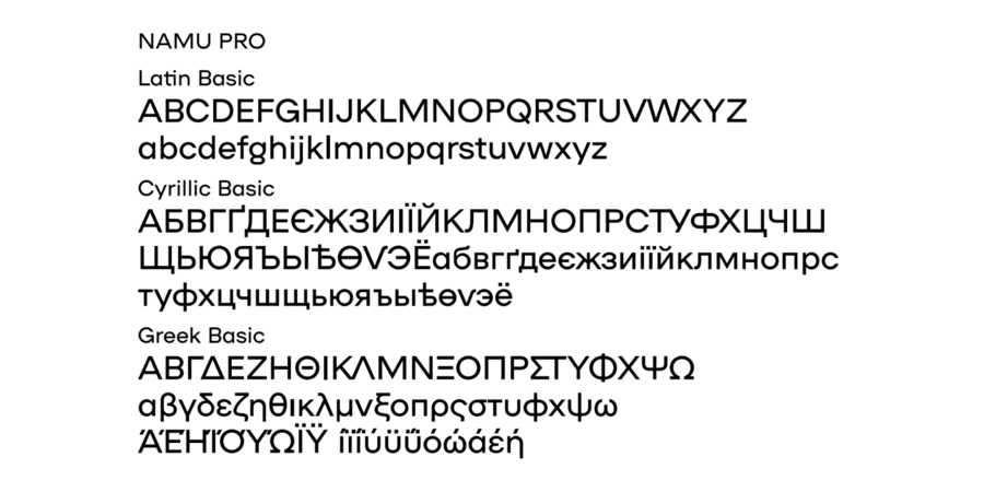 NAMU Pro is a full professional version of the free typeface for the National Art Museum of Ukraine. NAMU is a geometric sans serif with a deep history and daring experiments. Red Dot winner 2019 at Corporate Design and Identity category. At the end of 2018, the National Art Museum of Ukraine and Banda agency presented a new identity. The NAMU typeface became the basis of the visual style. To create this basis, designer Dmytro Rastvortsev immersed himself in the research of the museum fund, archival documents and outlines of ancient letters. As a result, the final NAMU typeface has 20 stylistic sets in the NAMU Pro version and 9 separate font styles for each historical period. NAMU typeface is free for commercial and non-commercial use. But the font files must not be decompiled. License Creative Commons CC BY-ND 4.0. The typeface created by Dmytro Rastvortsev in 2018-2022.