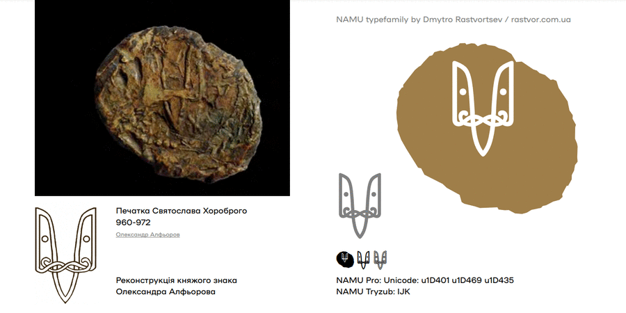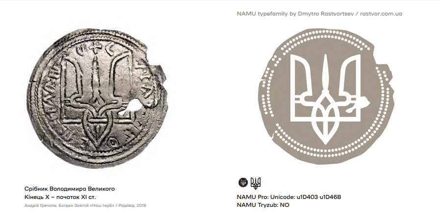 NAMU Tryzub is a non-alphabetic font with different versions of the coat of arms of Ukraine from free typeface for the National Art Museum of Ukraine. NAMU is a geometric sans serif with a deep history and daring experiments. Red Dot winner 2019 at Corporate Design and Identity category. At the end of 2018, the National Art Museum of Ukraine and Banda agency presented a new identity. The NAMU typeface became the basis of the visual style. To create this basis, designer Dmytro Rastvortsev immersed himself in the research of the museum fund, archival documents and outlines of ancient letters. As a result, the final NAMU typeface has 20 stylistic sets in the NAMU Pro version and 9 separate font styles for each historical period. NAMU typeface is free for commercial and non-commercial use. But the font files must not be decompiled. License Creative Commons CC BY-ND 4.0. Historical images of the Ukrainian trident from the book by Andriy Grechilo, Bogdan Zavitii "Our coat of arms" / Rodovid, 2018. The typeface created by Dmytro Rastvortsev in 2018-2022.