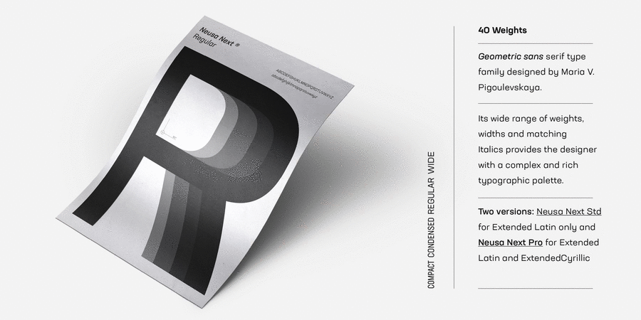 Neusa Next Pro is a geometric sans serif type family with wide range of weights, widths and matching italics. It provides the designer with a complex and rich typographic palette. Designed and released as Neusa in 2012, it was initially conceived as a type family with condensed proportions. Suitable for text, it was also equipped with distinctive characteristics that stood out in display use. Today Neusa Next builds on the original idea, expanding its character set to extended Cyrillic and introducing three more widths: Compact, Regular and Wide, each one with its own personality. The design draws inspiration from the early space explorations, including the iconic "Life" magazine coverage of the 1969 Apollo program and especially the works of Swiss design. The Neusa Next family consists of 20 weights, five per width, with matching italics, for a total of 40 individual styles. OpenType features include localised forms for Bashkir, Bulgarian, Catalan, Chuvash, Dutch, Macedonian, Moldovan, Romanian and Serbian, as well as inferiors, superiors, fractions, case sensitive punctuation and a special stylistic set featuring space themed icons. Language support includes Latin and Cyrillic scripts, covering most Western and Central European Latin-based languages. Designed by Mariya Pigoulevskaya in 2017. Neusa Pro™ is a trademark of The Northern Block.