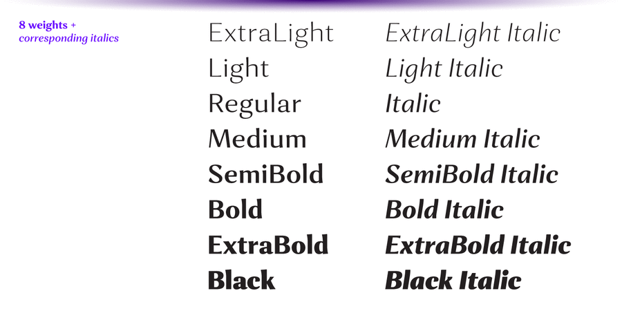 The typeface comes in 8 weights + corresponding real italics, each supporting numerous Latin-based languages as well as major Cyrillic languages. It is packed with OpenType features like ligatures, small caps, 5 sets of digits, 4 stylistic sets in romans and 1 in italics, superiors and inferiors, fractions, ordinals, respective punctuation varieties including all-cap punctuation, as well as language-specific alternates.