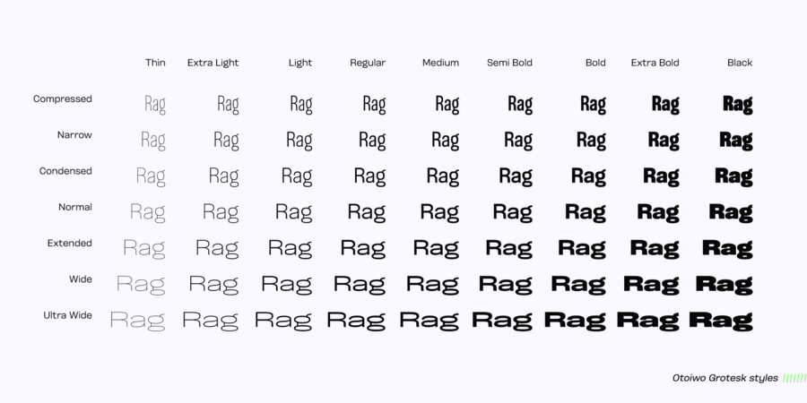 Otoiwo Grotesk is an extremely versatile sans-serif typeface with a closed aperture. It features whopping 126 styles over 7 widths, each containing 9 weights with corresponding italics.