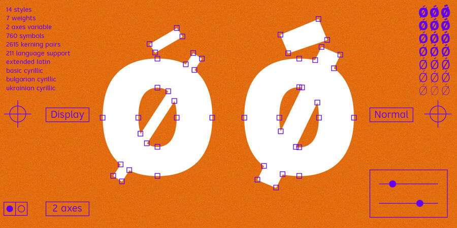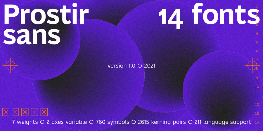 Prostir Sans is a powerful typeface of the humanistic sans serif. He strives to be a "workhorse" that does almost any job without unnecessary problems, while remaining expressive enough. Has large x-heights and small ink traps. The typeface looks emotional and feels free, combining smooth curves and contrasting connections. It consists of 2 conditional parts – Basic and Display, which differ in the thickness of diacritical symbols and additional elements. This contrast adds unusual rhythm and liveliness. It has 7 grades in weight and and supports variable, adjustable on two axes, which allows you to fine-tune the desired style with sliders. Total glyph set: 753 glyphs; 14 styles (7 weights + alternative styles); Support 210+ languages (Latin Extended, Cyrillic Basic + Bulgarian letters). OpenType features: Proportional, oldstyle, circled, tabular numerals, superiors, fractions; Punctuations and symbols, Arrows, Stylistic sets, Ligatures, Case-sensitive forms. A font style Prostir Sans Display Heavy is free for unlimited use under the "Desktop" and "Web" licenses. The typeface was designed by Maksym Kobuzan in 2021.