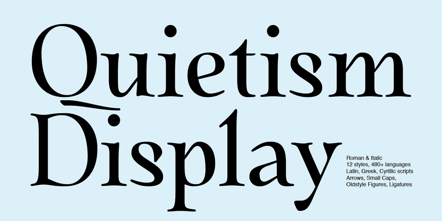 Optical Size: The typeface is represented by four subfamilies: Text (low contrast, high x-height – for paragraph 10-20 pt), Deck (medium contrast, medium x-height – for subheading 20+ pt), Display (high contrast, medium x-height – for heading 72+ pt), Poster (high contrast, low x-height – for big size 120+ pt). Variable Font: Quietism Variable is represented by Roman and Italic separeted files and has three axes: Weight (Thin–Black), Contrast (Low-High), and X-Height (Low-High). Variable fonts provides more options than static fonts and includes thousands of styles that you can access using a sliders on graphic editor or via CSS on web browser. Mixing different axes gives you extra styles not represented by static fonts. Small Caps: Lowercase letters and Oldstyle Figures are replaced with Small Capitals forms. Capitals to Small Caps: Uppercase letters, all figures, and some punctuation are replaced with Small Capitals forms. Case Sensitive Forms: ()[]{}‹›«»-–—•·#%‰@ and Arrows are centered on capitals. Oldstyle figures are replaced with Lining figures. Oldstyle Figures: 0123456789 #%‰. Designed to work with lowercase letters. Used by default. Lining Figures: 0123456789 #%‰. Figures are the same height as uppercase letters (cap height). Proportional Figures: Lining, Oldstyle, Small Caps, Capitals to Small Caps. Tabular Figures: Lining, Oldstyle, Small Caps, Capitals to Small Caps. Ordinals: adehnorst. Superscript, Subscript, Numerator, Denominator: 0123456789. Fractions: ¼½¾⅐⅑⅒⅓⅔⅕⅖⅗⅘⅙⅚⅛⅜⅝⅞⅟ (precomposed). Any other fractions (even those typed through a slash) will also be displayed correctly, with the automatic replacement to Numerator + fraction + Denominator. Slashed Zero: All 0 figures. Contextual Alternates: Number sign character (#) before uppercase letters is replaced by its version centered on capitals. Hyphen character (-) between two uppercase letters is replaced by its version centered on capitals. First of two TT letters is replaced by its alternate form. Letters vwy before the letters fijmnprtuvwxy are replaced with an alternate shorter versions that fits better in the context. Contextual Alternates (Greek): ΆΈΉΊΌΎΏ. Greek uppercase accented characters lose their tonos accent and retain only dieresis in All Caps and Small Caps modes. Turned on by default. If you need tonos accents in All Caps then turn off Contextual Alternates (calt) feature. Stylistic Alternates: FTГТИЦЩцщ and their versions with diacritical marks. Stylistic Set 01 “Arrows”: Left <- Right -> Up <| Down |> Left Right <-> Up Down <|> North West <\ North East /> South West South East \>. Stylistic Set 02 “Round-Square Cyrillic”: ДИЙЍЛФвгджзийѝклнптцчшщьъю characters are replaced with its Bulgarian or Russian forms. Stylistic Set 03 “Cyrillic Tse Shcha short tails”: ЦЩцщ characters are replaced with its alternate form with short tail. Stylistic Set 04 “Cyrillic I full serifs”: ИЙЍӢ characters are replaced with its alternate form with inner serifs. Stylistic Set 05 “FT bent inward serif”: FTГ characters and their versions with diacritical marks are replaced with its alternate form with right head serif that bent inside. Stylistic Set 06 “Small Caps centered on Capitals”: Small Caps are vertically centered on uppercase letters. Standard Ligatures: fi fl fb ff fh fj fk ffb ffh ffi ffj ffk ffl. Discretionary Ligatures: Th ct st. Localized Forms: 52 character substitutions for Azeri, Bulgarian, Catalan, Dutch, German, Kazakh, Macedonian, Moldavian, Polish, Romanian, Serbian, Tatar, Turkish. Glyph Composition/Decomposition (Diacritics): Full Latin and based Vietnamese set of diacritics (571 characters) precomposed.