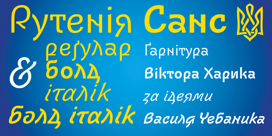 This typeface is the embodiment of the ideas of the famous Ukrainian calligrapher Vasyl Chebanyk to restore the individual features of the Ukrainian alphabet and rid it of forced moscowization and approaching to the "Civil Script" of Peter I. Ruthenia Sans is a modern Ukrainian sans serif with a touch of calligraphy for a wide range of tasks. It also contains historical alternatives, fractions and old style figures, Cyrillic alphanumeric system, decorative floral symbols and a wide range of arrows. Ruthenia Sans can work as a grotesque pair with the original Rutenia typeface, thus creating a type system. The typeface was designed by Victor Kharyk in 2019-2022.