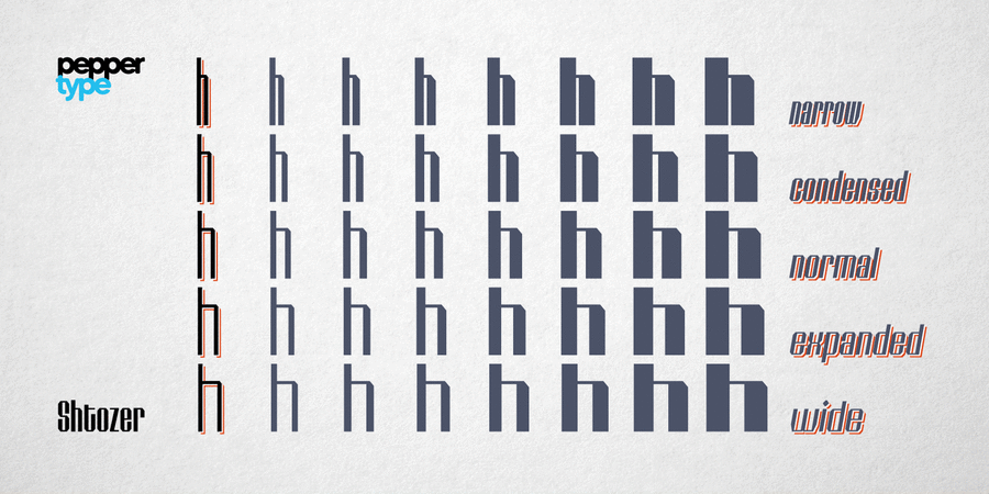 Low-contrast vesion of Shtozer. A retro-themed display typeface based on designs of 1960s and 1970s and additionally inspired by Cyrillic ornate lettering Vyaz. It comes in 8 weights, with 5 width variations each, all accompanied with respective obliques – making 80 styles altogether. Shtozer is a font family with extensive language coverage including Cyrillic script. It also contains numerous OpenType features and alternate glyphs to vivify the typesetting. The typeface was designed by Oleh Lishchuk in 2020.