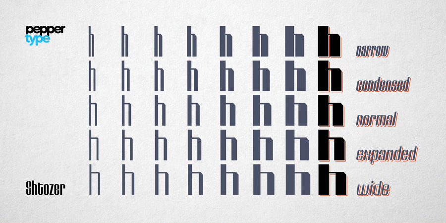 Maximum contrast version of Shtozer. A retro-themed display typeface based on designs of 1960s and 1970s and additionally inspired by Cyrillic ornate lettering Vyaz. It comes in 8 weights, with 5 width variations each, all accompanied with respective obliques – making 80 styles altogether. Shtozer is a font family with extensive language coverage including Cyrillic script. It also contains numerous OpenType features and alternate glyphs to vivify the typesetting. The typeface was designed by Oleh Lishchuk in 2020.