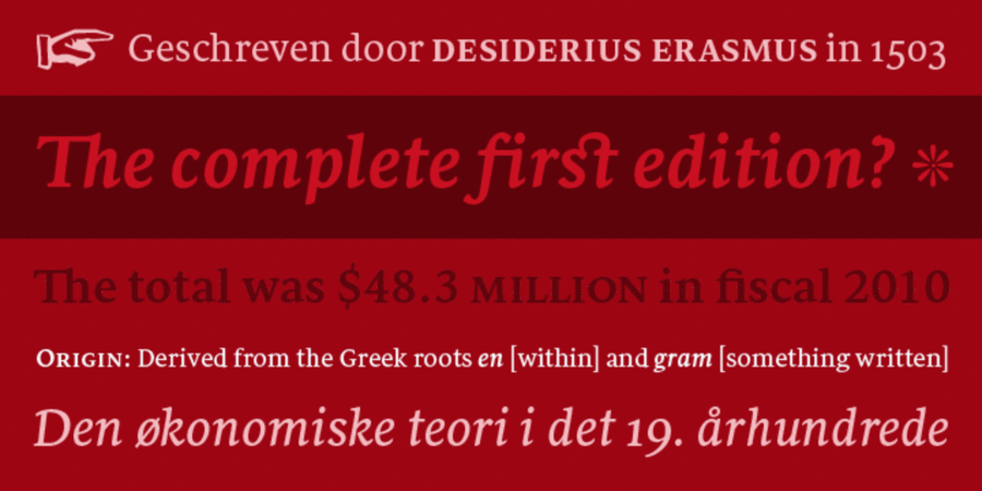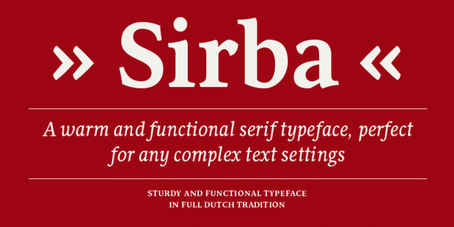 Sirba, a seriffed typeface family with a friendly personality, was conceived especially for the demands in complex text environments like dictionaries, academic texts annual reports, novels and magazines. It has many design features that were particularly designed with Sirba’s purpose in mind. Because of its open counters, the large x-height, short ascenders and descenders, this typeface conveys a pleasant reading experience and high legibility even in small sizes. Sirba is a low-contrast typeface, contemporary but with a classical touch, revealing its beauty in design details, such as the asymmetrical bottom serifs, curved bracketing and calligraphically reminiscent terminals. Furthermore the capitals appear integrated into the text, thanks to the low cap height and the constant width of all tabular numbers between the weights make this typeface very usable in annual reports and tables. Sirba is available in the four classic styles plus a special heavy (Black) version, which is particular in that its proportions are designed so the counters remain big enough when set in very small text sizes. This means that Sirba Black’s spacing and letter width are rather generous in comparison to other typefaces of that colour. This ensure excellent legibility. During the design of the typeface family much attention was given to the italic and regular as counterparts of each other. The italic distinguishes itself just enough while reading without creating strange spots within the text when looking at the text as a whole. Sirba CYR’s character set covers over 80 languages that use the Latin, Cyrillic script plus Polytonic Greek and a full set of phonetic symbols. It also includes many typographical niceties, such as a set of arrows, ornaments, extended ligatures, small caps, 5 sets of numerals and more. Intensive study of typefaces from the period of letterpress printing used in bibles and dictionaries, in particular for small type sizes, and the understanding of the typefaces’ “secrets”, influenced the design and concept of Sirba to a great extend. The typeface was designed by Nicolien van der Keur in 2010.