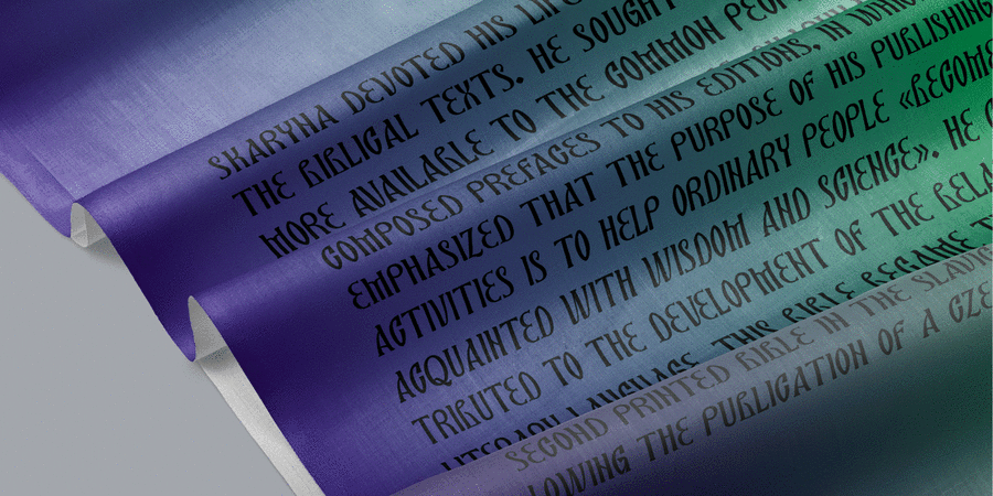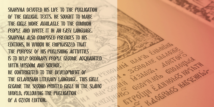 Skaryna 2017 Title is a revival of the original typeface designed and cut by Francisk Skaryna in 1517–1519. Skaryna 2017 Title is designed to celebrate the 500th anniversary of the original work by Francisk Skaryna (lat. Franciscus Scorina de Poloczko) — scientist and educator from Polotsk (current Belarus). The original designs contain only Cyrillic characters. So Latin and additional characters were added to make the legacy of Francisk available for the World. The revival was designed to stay close to the original and remain a little bit inaccurate as early Renaissance printing technologies were. This project was sponsored by Anton Bryl. The typeface designed by Aliaksei Koval in 2020.