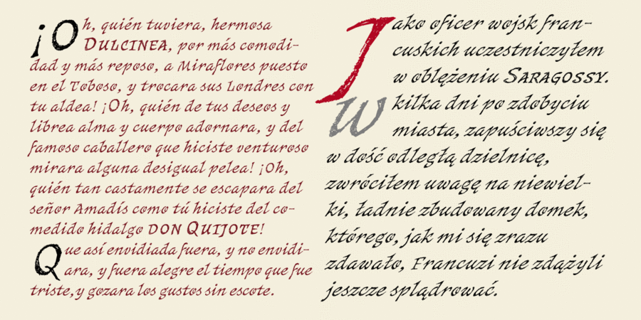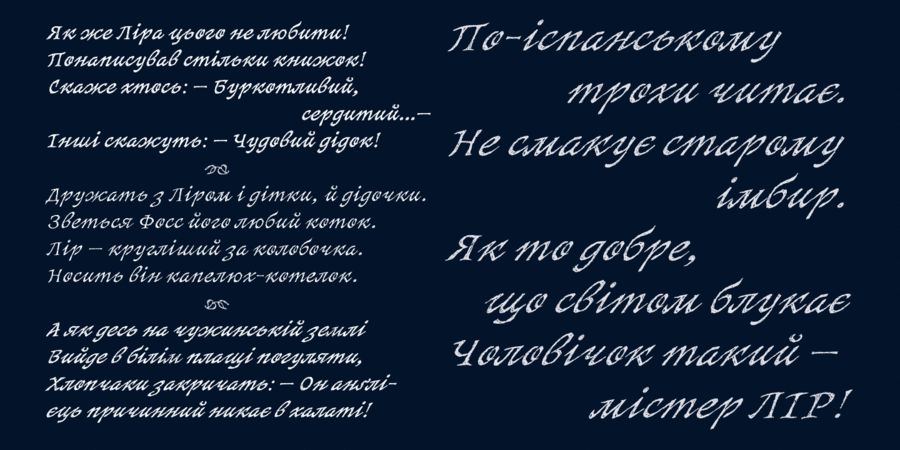 This typeface is a somewhat naive and ironic generalized idea of “perfect italic”, intentionally executed in a shabby sketchy manner. This makes it lively and informal and allows you to simulate a print or writing on thick paper. In large sizes, the font looks like distinctly display with a touch of handmade, and in small sizes it is legible enough to read without losing its informal feeling. It combines well with drawings and resembles a school penmanship, which makes it appropriate for the design of children's books. SketchItalic supports European Latin and modern Slavic Cyrillic, it also contains ornamental coordinated fleurons. Four standard styles expand the range of use – varying sizes, highlighting in the text, imitation of various handwritings, etc. The typeface was designed by Viktor Kharyk in 2019.